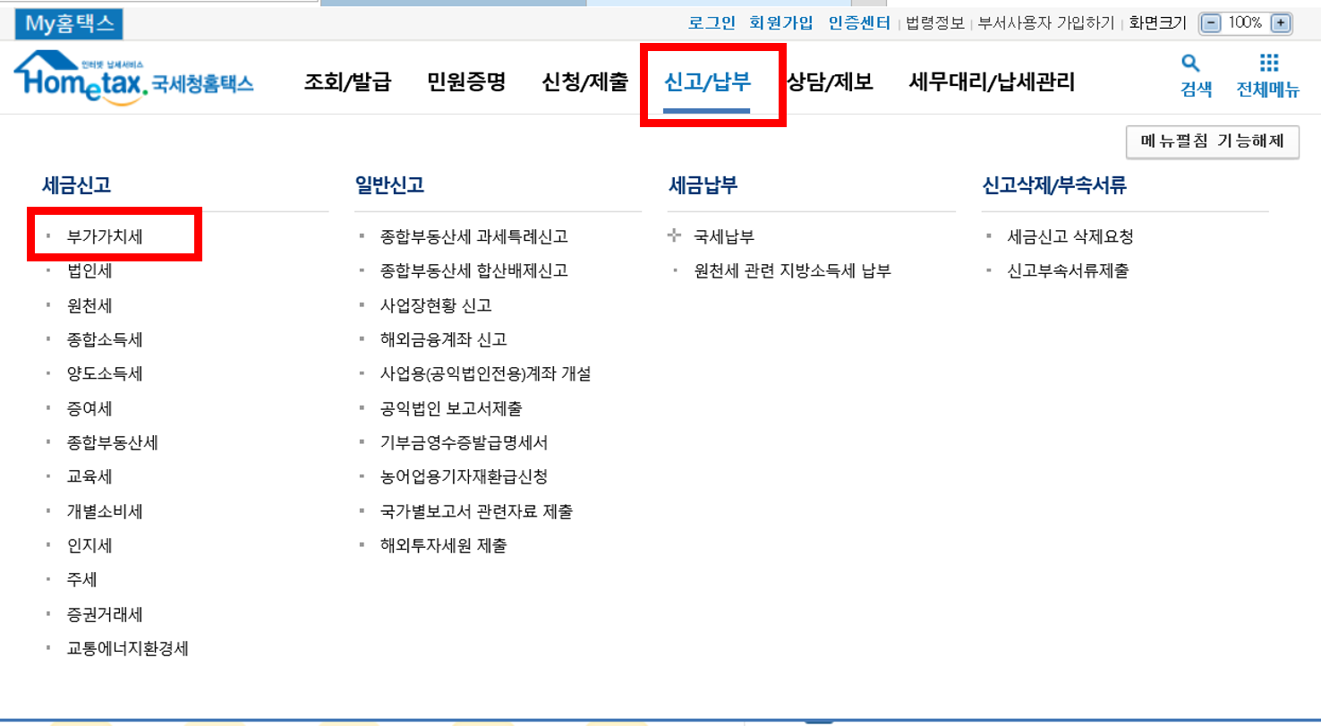 - 세금 신고 메뉴 선택: 상단 메뉴에서 '세금신고'를 클릭한 후 '부가가치세 신고'를 선택합니다.