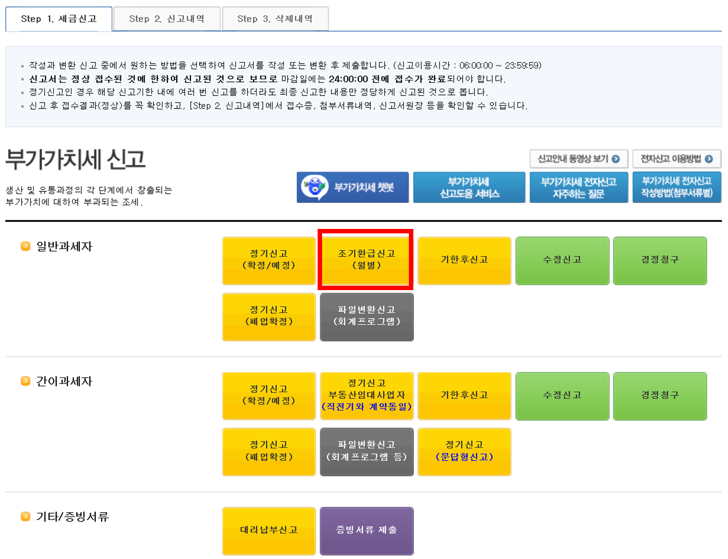 - 일반과세자 신고: '일반과세자 신고'를 클릭한 후 '월별 조기환급신고' 메뉴를 선택합니다.
