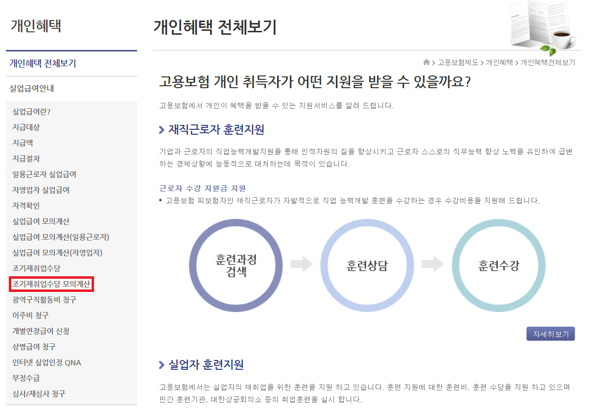 - 개인 서비스 → 실업급여 → 조기재취업수당 → 신청