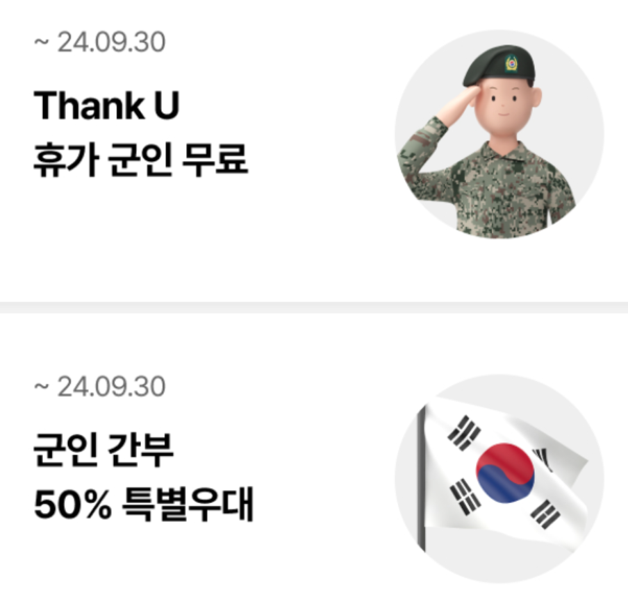 - 군인 할인: 휴가 중 1회 무료 이용