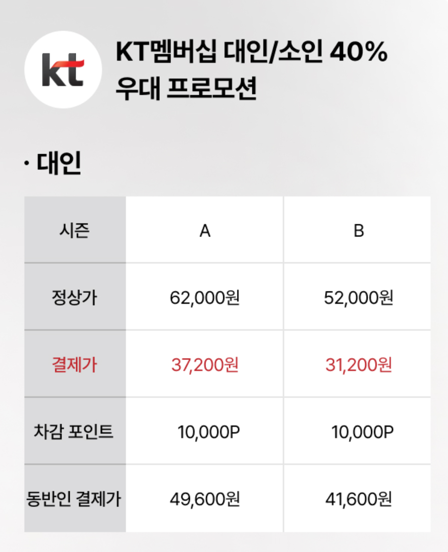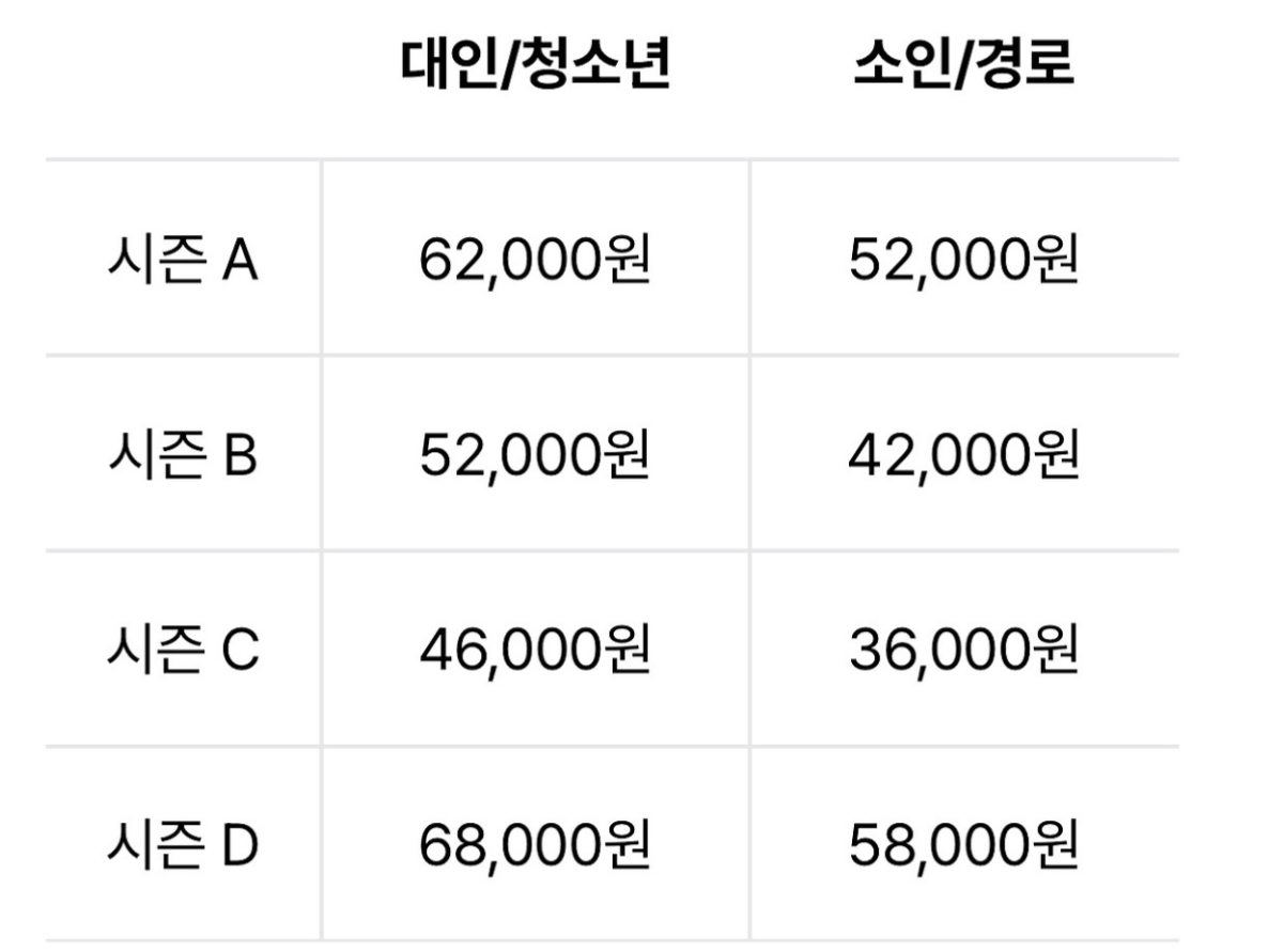 - 학생 할인: 시즌 A 39,000원 (스마트 예약), 시즌 B 34,000원 (스마트 예약)