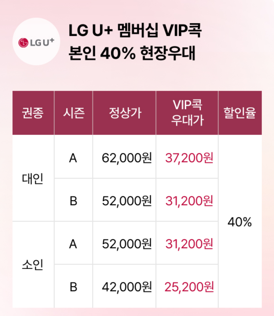 - 통신사 할인: KT 멤버십 40% 할인, LG U+ VIP/VVIP 혜택