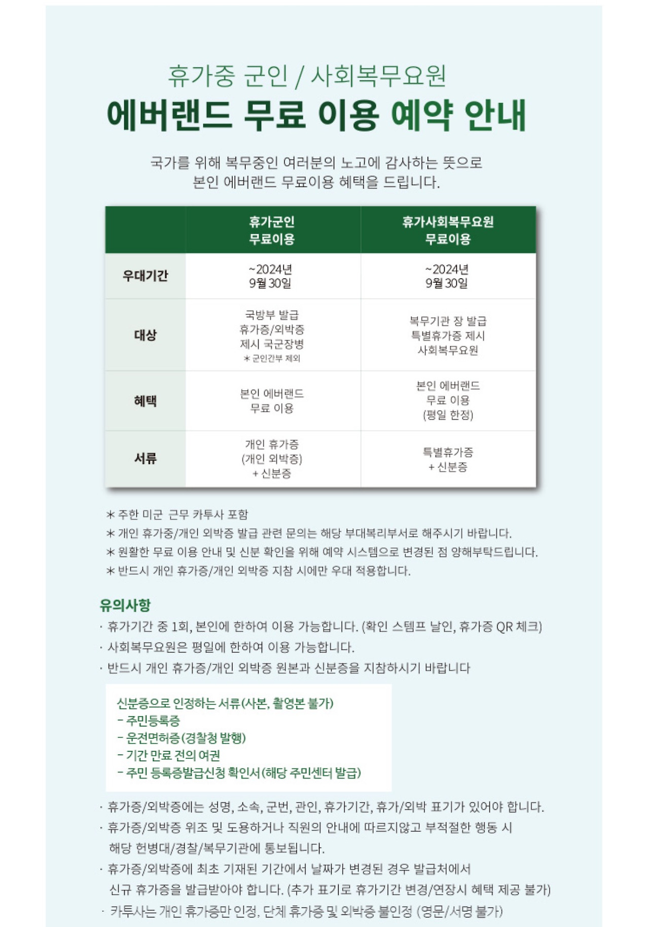 군인, 의경, 해경, 의무 소방원, 사회복무요원, 주한 미군 근무 카투사는 휴가기간 중 1회, 본인에 한해 자유이용권을 무료로 이용할 수 있습니다. 신분증 서류를 지참해야 하며, 에버랜드 정문 앞 인포메이션센터에서 본인 확인 후 이용권 교환증을 수령할 수 있습니다. 이러한 혜택을 통해 군인들도 에버랜드를 저렴하게 즐길 수 있습니다.