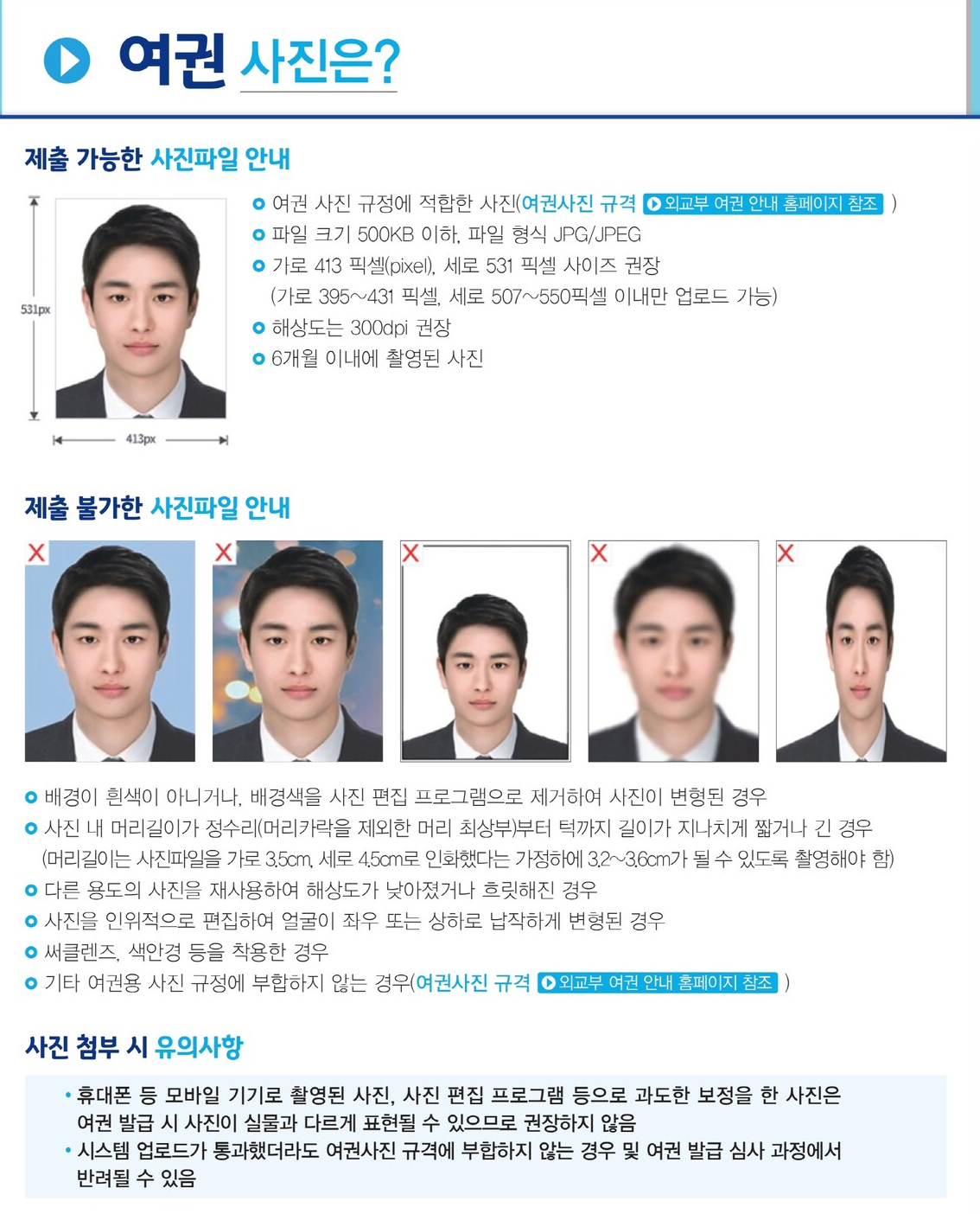 여권 사진은 매우 중요한 요소입니다. 다음 규정을 반드시 지켜야 합니다: