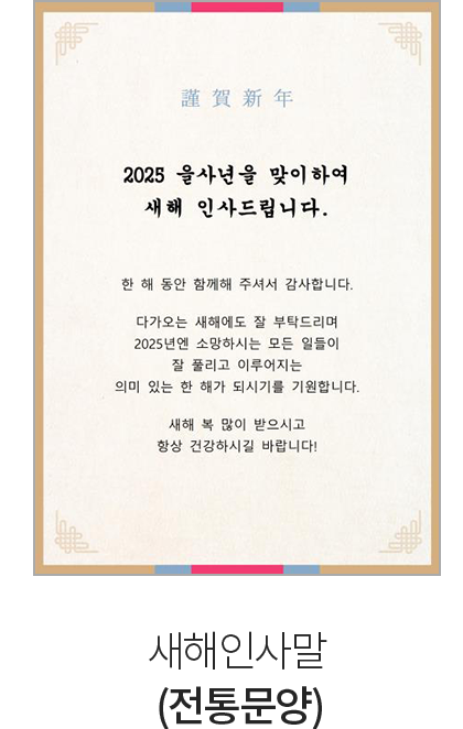 • "한 해 동안 저를 위해 늘 애써주신 부모님, 새해에도 건강하고 행복하게 지내시길 진심으로 기원드립니다."