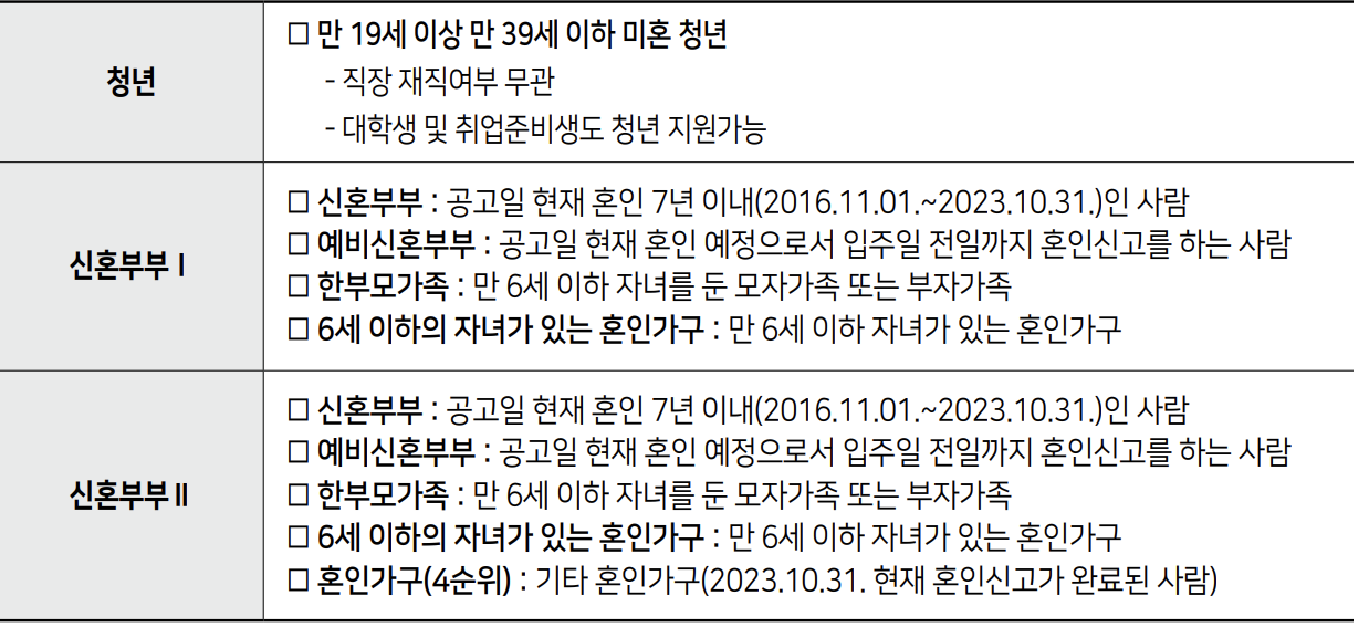 신혼부부형은 연령은 동일하게 19세 이상 39세 이하이며, 혼인 후 7년 이내의 신혼부부여야 합니다. 예비 신혼부부의 경우 입주 전까지 혼인 사실을 입증해야 합니다. 또한, 무주택이어야 하며, 자동차 가격이 3,708만원 이내여야 합니다. 자산은 34,500만원 이하여야 하며, 소득 기준은 2인일 경우 6,498,854원이어야 합니다.