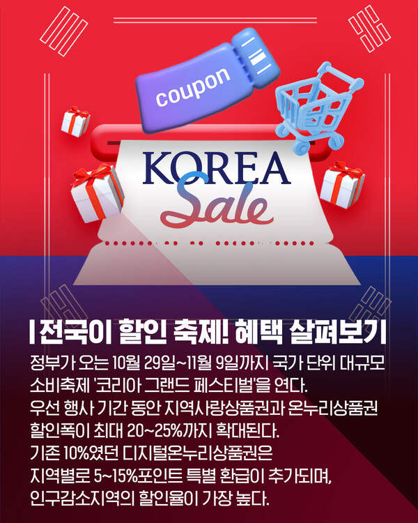 2025년 10월 29일부터 11월 9일까지 12일간 진행되는 코리아 그랜드 페스티벌은 소비자, 소상공인, 그리고 우리 경제 모두에게 희망이 되는 특별한 행사입니다. 최대 50% 이상의 할인, 온누리상품권 10% 환급, 지역화폐 추가 혜택 등 다양한 프로모션을 통해 실질적인 경제적 이득을 누릴 수 있습니다. 전국 각지에서 펼쳐지는 풍성한 이벤트와 문화 프로그램도 함께 즐기며, 가족과 친구들과 즐거운 쇼핑 추억을 만들어보시기 바랍니다.