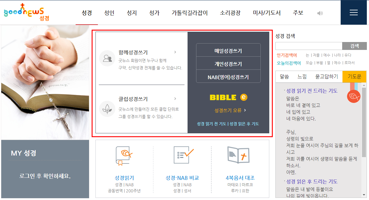 가톨릭 굿뉴스 포털에서 제공하는 성경, 매일미사, 성무일도, 성가 등 신앙생활에 필요한 모든 정보를 한눈에 살펴보세요. 교구주보부터 가톨릭뉴스까지, 신자들의 영적 성장을 위한 완벽한 안내서입니다.