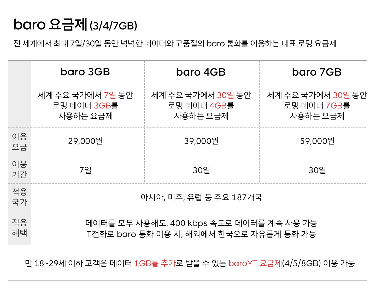 해외에서 데이터를 사용할 수 있는 서비스로, 다양한 용량과 기간에 따른 요금제가 있습니다. 특히 baro 요금제는 많은 여행객들이 선호하는 옵션입니다.